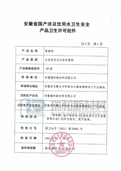 2021年1月28日,公司絮凝剂产品获得“涉及饮用水卫生安全产品卫生许可批件”(以下简称“涉水卫生批件”)。 “涉水卫生批件”是证明生产涉及饮用水产品企业卫生安全、产品质量达标的唯一权威性文件。国家在相关法规中明确指出:凡在饮用水生产和供应过程中与水接触的输配水设备、防护材料、化学处理剂、水质处理器、饮水消毒设备等均称为涉及饮用水卫生安全产品,简称“涉水产品”。 公司于2020年12月向安徽省卫生健康委员会提出了办理絮凝剂产品“涉水卫生批件”的申请。2020年12月24日,安徽省卫生健康委员会主要负责人莅临安徽瑞和开展许可证发证前审查,重点审查了基地生产设施、絮凝剂产品生产过程、原料和成品贮存、运输以及从业人员卫生及产品卫生许可情况等,对公司絮凝剂产品及卫生生产管理工作给予充分肯定。 公司絮凝剂产品顺利获得涉水卫生批件,为公司在涉水产品领域进一步研发与市场拓展提供了强有力保障。